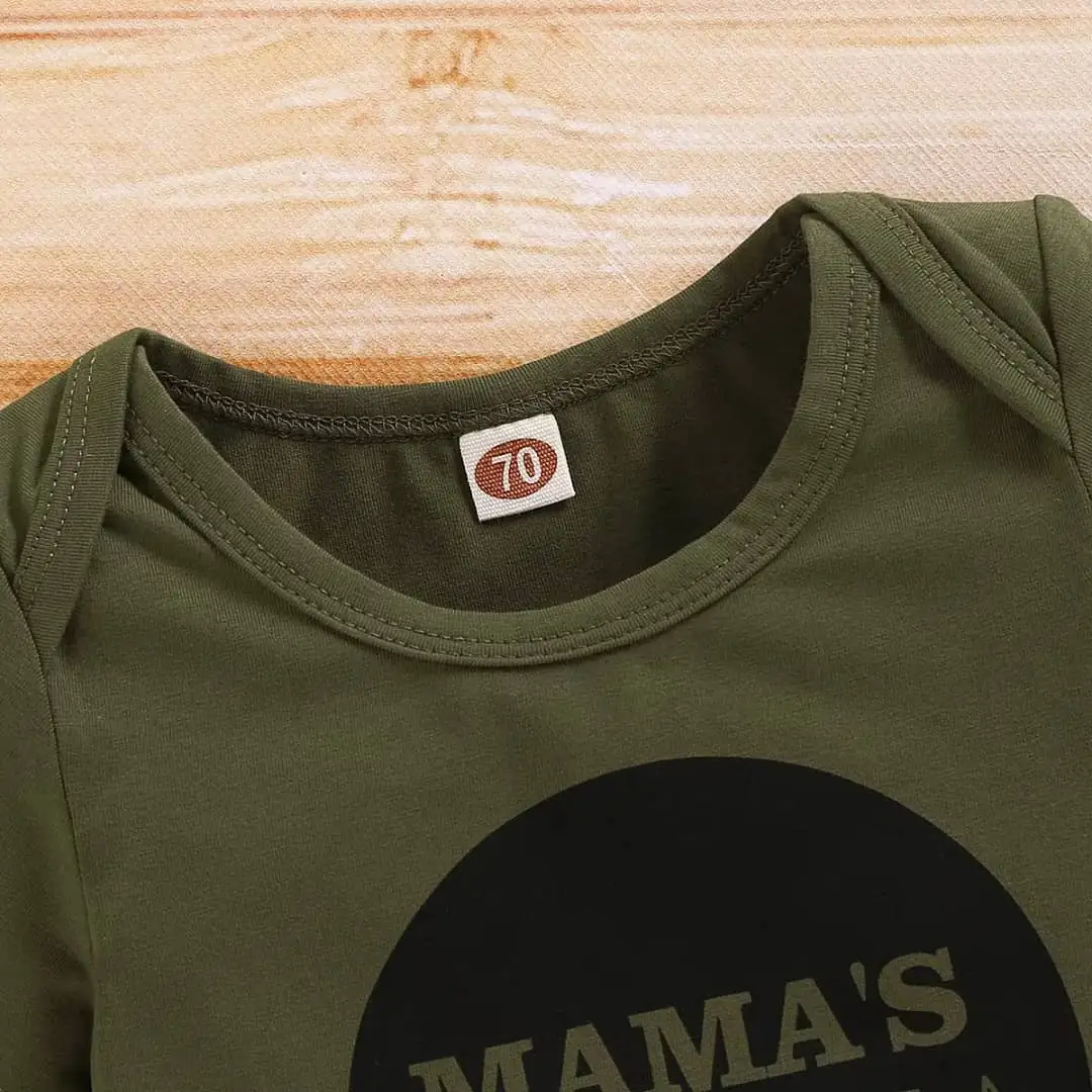 This 3-piece summer outfit for newborn and toddler boys (0-18 months) combines comfort, style, and practicality. Featuring a short-sleeve romper with letter prints, camouflage pants